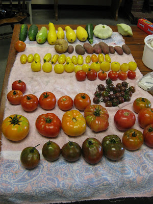 Janice was in doing some work regarding our spring plant sale offerings which include lots of neat vegetable varieties. This prompted my blog topic for today. For the past five years, we've been offering plants of heirloom tomatoes and a wide range of variable veggies and herbs selected each year. Above is a shot of freshly sliced heirloom tomatoes f