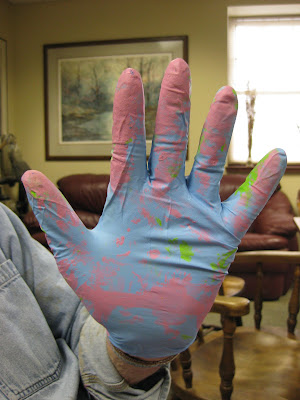 Aside from workshop planning, I was able to make some more orders and continue to work on upcoming presentations. I'll present up at Olbrich Botanical Gardens (Madison, WI) tomorrow night on annuals and have a presentation this Saturday as well. Dr. Gredler and Bill worked on painting obelisks while Larry spent most of the day working on our CASE endloader and getting it ready for spring. Kay came in to work on plant sale labels and once that was complete, was drafted to help get handouts ready for upcoming presentations. We also saw Mary W., Gary, Jumbo Jim, Deb, Mike and L.P. Tree Service was here to grind up the pines (Holiday Lights Show) in to mulch for the gardens. Busy day! Dr. Gredler's gloves (below) always let you know what colors he's dabbling with that day! :)
