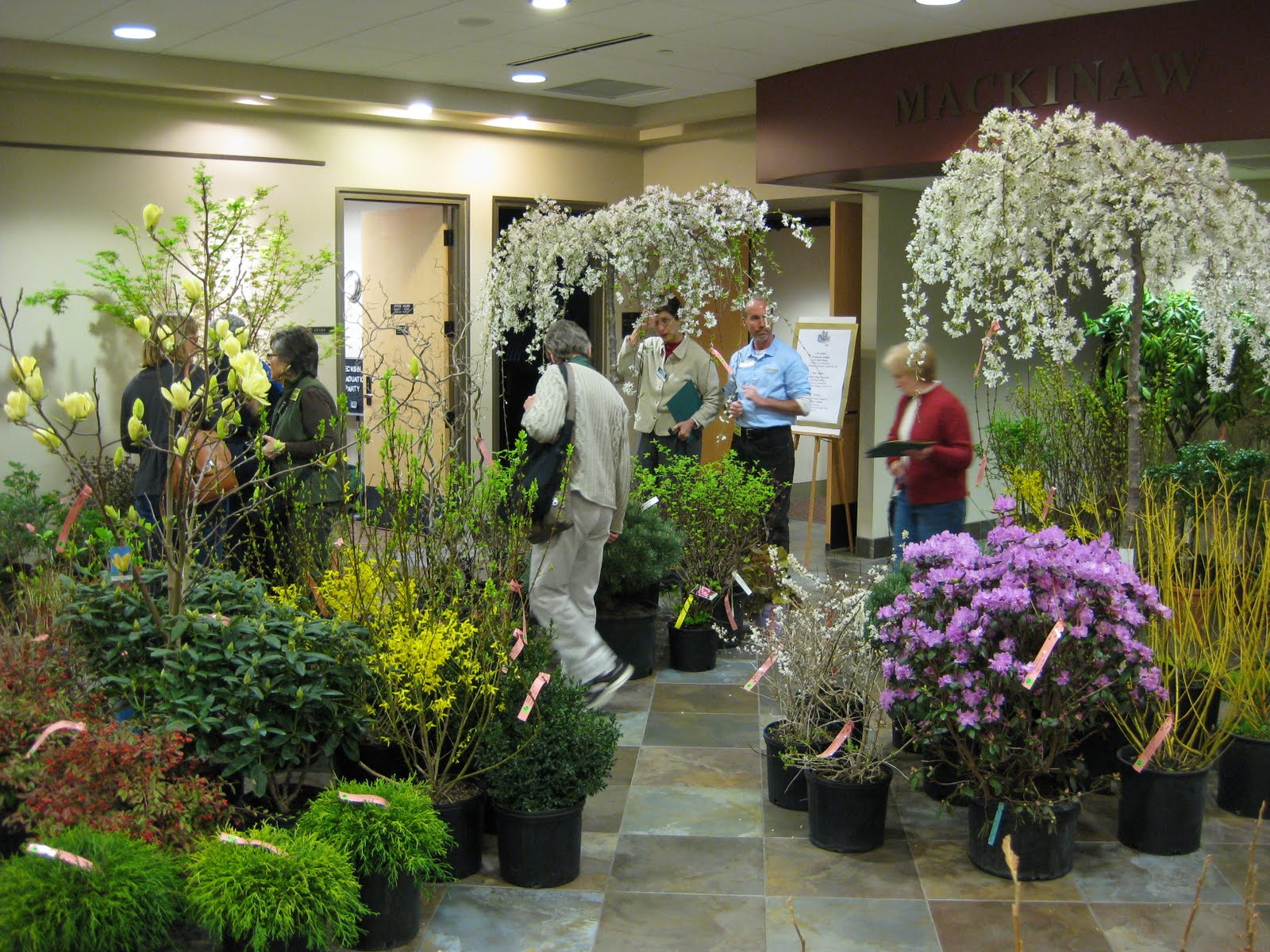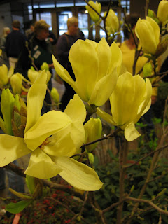 g to dinner with the committee that puts this event together. Kudos to the group for organizing a successful event and although I can't remember everyone's name (on the committee), "hats off" to Laurel, Reini, Audrey, Dan, Paul, Ashley, Pam and so many others that ran a smooth event. There were also vendors and wonderful displays as seen in these images. My daughter bought some plants and we received some nice parting gifts prior to our 5 hour trip back to Janesville. Our only curve ball was that my daughter left her wallet in the hotel room and we had a short diversion for "wallet retrieval." I enjoy any chance I get to return to Michigan as I lived there (Niles, MI) for two years and love the state. Grand Haven is a really neat community along the lake and I look forward to visiting again in the future. Above and to the left are the beautiful blooms (forced early of course) of the 'Butterfly' magnolia and to the right are forsythia blooms.