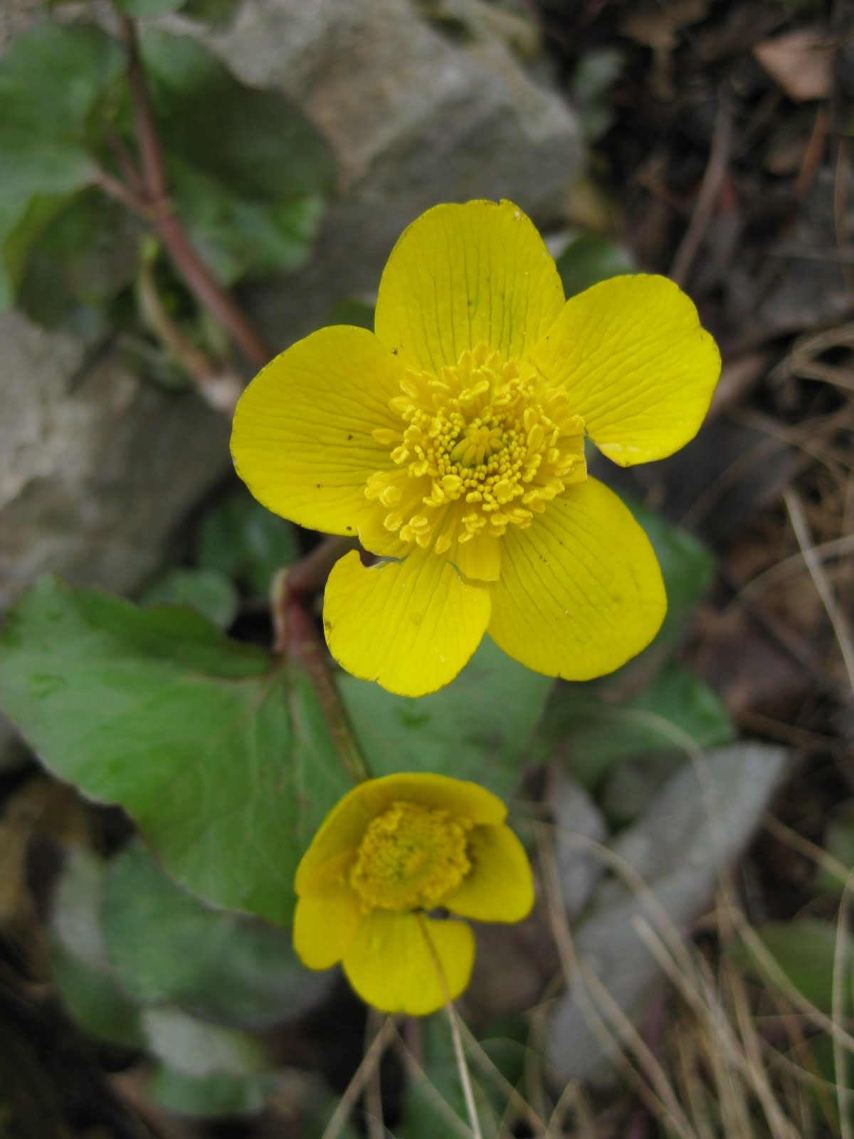folium) species in the woodland walk. I read that this species is native to the pine forests in Turkey. I love this species and it's not shy on a significant contribution of blue. There is actually quite a bit of color out in the gardens including the vivid yellow of the marsh marigold (Caltha palustris) seen to the right. When our shoreline flooded back in 2008, this was one of the few plants that didn't "bat an eye" (or die) and it's common name certainly lends credence to its ability to withstand significantly damp soils. The weather doesn't look the best over the next couple of days and I hope it doesn't affect the enthusiasm for our Earth Day activities or tree sale. Details for both events are on our website. Progress in the Japanese garden is at a halt because of all the rains. Below is the new, lower Japanese garden pool that is currently unworkable at this point. Oh well.