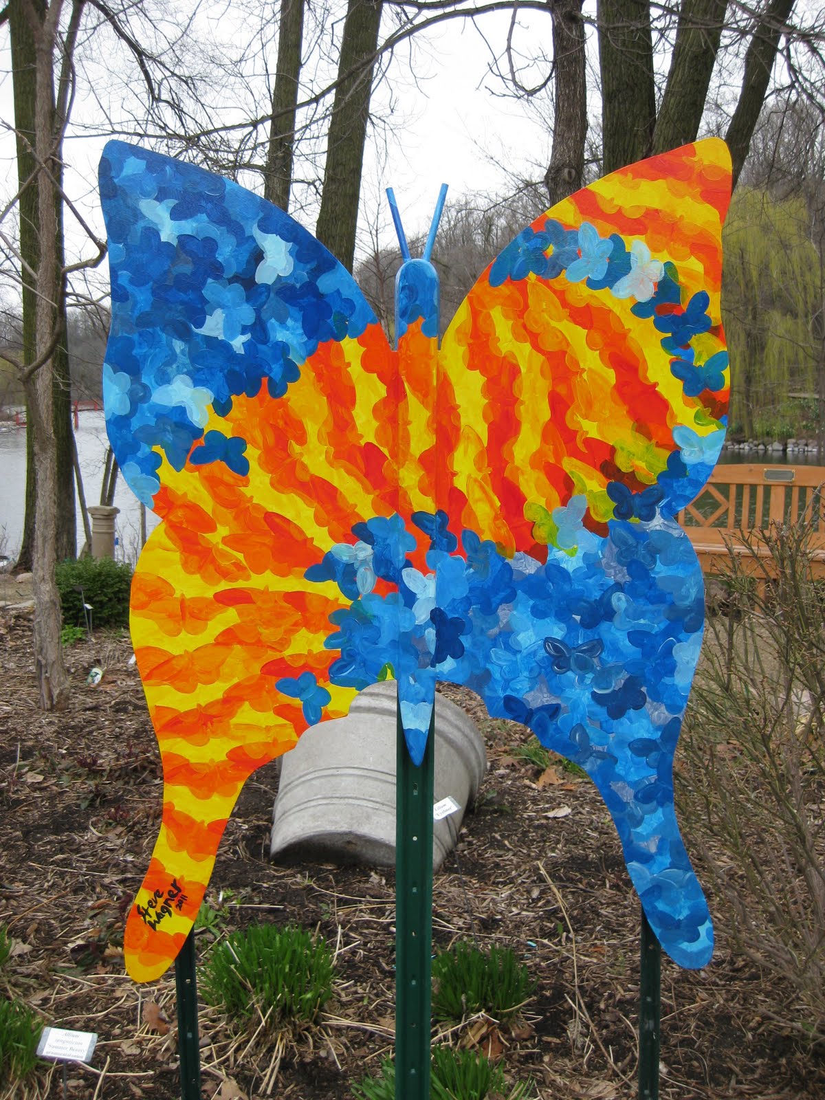 John and Janice had previously divided up and potted some perennials that will be freebies for the attendees. I anticipate this will be a popular topic and I hope to report about a big crowd in the blog tomorrow! The butterflies have landed! Marv and Terry put up three of our 34 butterflies out in the gardens and did a nice job figuring out the best way to anchor them. The daisies last year taught us about the issues of wind and proper anchoring. Each butterfly will have three stakes which will certainly be vital for those butterflies that are heavier because of stained glass, beads, etc. We'll have the rest of them out next week with signs so they're ready to be enjoyed by the visiting public in May.Marv and Terry also set-up and secured obelisks, worked on container inserts and finished the day by replacing the gravel in one of our "weedier" paths that has a lot of soil and weeds already starting. Big John dug out and divided some grasses early today and helped prepare for the event this evening. He also spread plenty of shredded bark mulch and continued some of his digging projects. Marianne, aside from her seed starting, helped me with all sorts of handout preparations, tree sale tasks, her cutting display and a sign inventory that will be converted shortly to the new, "fancy" labels. Larry ran some errands for me, checked over our valve system for the irrigation (leaking...) and spent this morning unloading 900 bags of blended compost that will supplement our current supply for our upcoming tree sale and spring plant sale. We also saw Maury, Little Jerry and some others over here as well. Below are the swelling buds of yellow buckeye (Aesculus octandra) which is a darn nice tree. We have one near the horticulture center and we should see blooms within the next three weeks. Further below is the ground level bloom of the American (or Canadian) ginger (Asarum canadense).