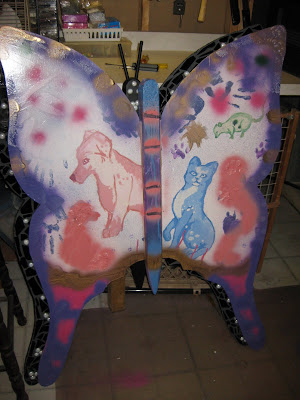 I'm not one to pick favorites but he butterflies shown here were finished by my daughters this weekend (albeit after the deadline!). My older daughter, Dejanique, and her boyfried Russell did the monarch above with the top being the stained glass arrangement and the bottom being the traditional monarch. They are both very artistic and my wife and I were quite impressed (that it as returned relatively on time too!). We were equally impressed with Luciana's butterfly below. The pastel shading is perfect and this butterfly represents her love of all animals. I didn't get a good shot of the other side as it was still drying (and our house still smells like spray paint). It will be nice to have the girls (and Russell) visit the gardens this year to see their butterflies and the 32 others that will be real features out in the gardens.