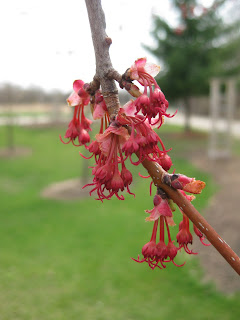 Nice shot to the right of the blooms of red maple (Acer rubrum) which are really quite conspicuous along with the young, red stems. Despite the chill and winds,
