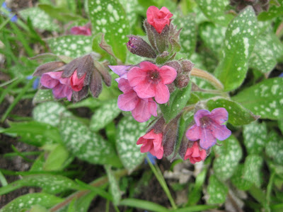 shredded bark over the entire daylily collection and Palmer Drive berm. This is about 5,000 square feet and the students did a remarkable job and had done the same job one year ago. This space is only accessible by hand and a crew like this is so appreciated for the "hands on" approach. We got a good 2.5 hours of solid volunteer work out of this gang and special thanks to Janice and particularly Marianne for working with the students. Marv, Terry, Big John, Dr. Gredler and I ran a perpetual convoy of mulch to keep the mulch supplies (five piles) from dwindling. We hope to see the kids this fall as well. I will say it's interesting observing the difference in motivation and work ethic with these kids and those that come to us thru community service channels. Directly below are the blooms of lungwort (Pulmonaria sp. 'Victorian Brooch') that come quite early and once gone, the spotted foliage takes over. I like lungwort a lot and it is quite durable in the shade garden (and deer don't nibble on it). Below the lungwort shot are forsythia blooms at peak. This is 'Happy Centennial' forsythia (Forsythia x intermedia) that is a compact variety with consistent flowers each year.