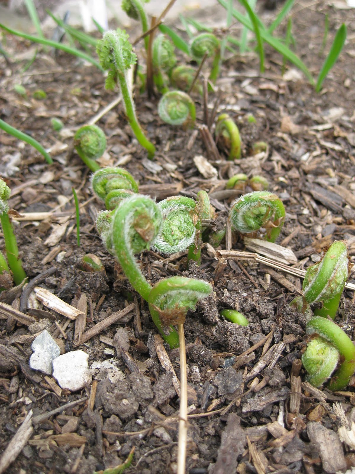 rn (left) is emerging quickly in our fern & moss garden and we're seeing many fiddleheads of various species poking up and testing the temperatures before unfurling (see to the right). After planting an additional 100 fern varieties last year in that space, it will be nice to observe and photograph our new varieties. Some of these ferns were also replacements for our losses after the flood of 2008 wiped out half that garden. Nature's Touch was here cleaning some of our water features and continued work on our improved water feat