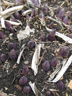 g to "spear" out of the ground. They'll grow very quickly with a return of warmth and this will be one of the samples that Becky N. will use at her Perennial Division seminar next Wednesday evening (April 20th, 6 pm - 8 pm). She'll be demonstrating the various techniques and timing for successful perennial division and will first explain the reasons for division. Becky will also be facilitating our Container Planting Workshop on May 18th (see our website) that will allow participants to comb thru our yard for goodies. That should be fun! To the right is one our bulb lawns with plenty of white Siberian squill (Scilla siberica 'Alba') that will bloom and reseed before we mow. In reality, the grass will be about 6" when we get in there; first with a weedwhip, followed immediately by a push mower. We let the bulbs photosynthesize as much as possible and have seen some nice perennialization of bulbs in these smaller lawn areas. The bottom picture shows the progress of the bluestone patio under the arbor in the North Point garden. I'm in briefly tomorrow for a meeting and next week has no shortage of tasks as we approach our Earth Day activities and Tree Sale, both of which are on April 22 and 23 (see www.rotarybotanicalgardens.org).