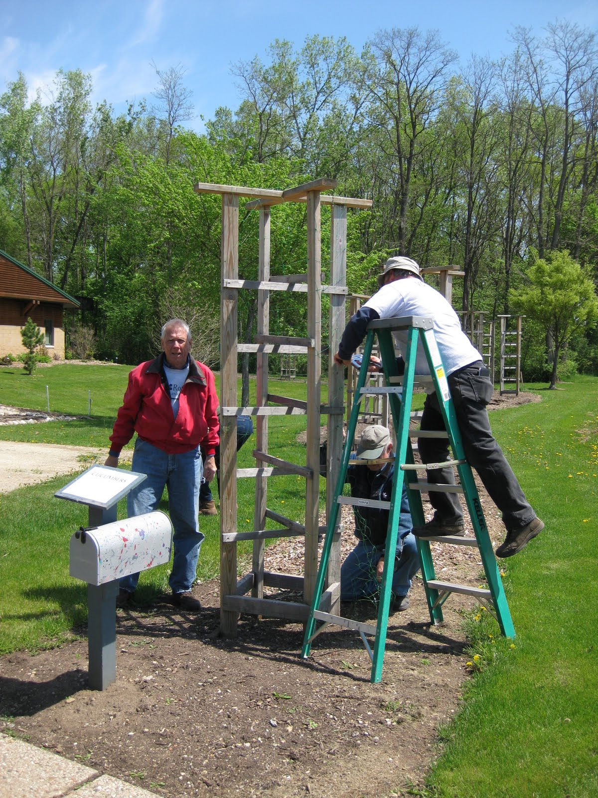 ed Marv who was working with Rollie, Urban, Pat and Ron W. on excavating an area behind a retaining wall that needed some fabric and other modifications. Pat and Ron had previously cleaned up a pathway and all four guys finished the morning by putting up some netting for Janice on the Horticulture Center vining supports. See the guys to the right. This netting should help our squash collection which will be seeded in very shortly. Del and Bob C. did a nice job spreading woodchip mulch around the sunken garden which is a arduous job due to accessab