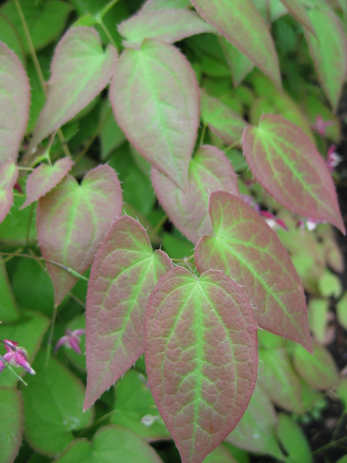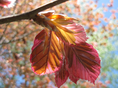 o be quite invasive. I'm seeing it "move" around and we're keeping a close eye on it. It does have some nice visual impact though, particularly right now. To the above left is the silver-patterned foliage of yellow archangel or deadnettle (Lamiastrum galeobdolon 'Herman's Pride') which will have yellow flowers along the stems very shortly. This is a clumping variety although there is a running version of this species ('Variegatum') that should be avoided as it really spreads like wildfire! To the right is the maroon-tinged foliage of the red barrenwort (Epimedium x rubrum) which still has some spring flowers but the clean foliage is quite fetching as well. I can't say enough about barrenworts for part shade and as tough groundcovers (non-spreading). Below is a shot (from underneath with some natural backlighting) of the emerging leaves of the tricolor European beech (Fagus sylvatica 'Roseo-Marginata') that is always a showstopper. Our specimen is about 12' tall (slow grower) and I hope visitors in 100 years will appreciate a much larger specimen and what those unique leaves have to offer the viewer.