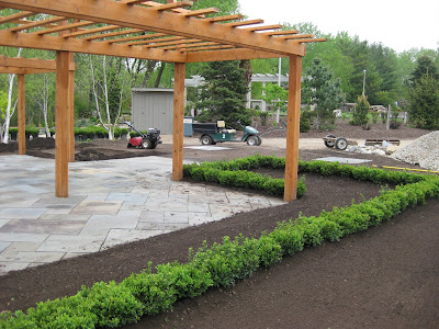 With the bluestone patio complete, the guys loosened up the soil and did a manual grading away fromt the patio. They then trenched and planted a whole lot of boxwoods (Buxus 'Green Velvet') that will define some narrow planting beds immediately adjacent to the arbor and patio. Our intent is to fill these spaces each year with colorful bulbs and annuals with a focus on scent. We hope to continue progress in this space daily and have looming irrigation and electrical service installation as well. This space, while small, has a view second to none and should be a popular spot. I've modified my design a bit as is always the case, the space is smaller in "reality" than it always looks on paper! Marv and Terry caught one of my layout errors this morning which I appreciate although I'm sure I shattered their belief that I never make mistakes....