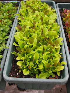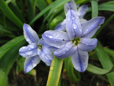 To the above right is an unexpected result of placing our new pyramids in the entrance garden. This might be the first blog to feature bird poop but I noticed all of our blue "pyramids" are suffering from this unwanted attention. Oh well. To the right is one of my deck planters with a nice batch of lettuce (Lactuca sp.) filling in well. My daughter is excited about this quick growth (seed sown 25 days ago on Easter Sunday). I'm ashamed to admit that I've not sown and eaten my own lettuce ever and look forward to it soon. Directly below are the blooms of the blue, spring starflower (Ipheion 'Rolf Fielder') that we planted last fall. These little clumps are offering a nice blue in a landscape that really lacks blue in the spring without some "bulbous assistance". We planted about 5,000 of these small bulbs last fall and hope they perennialize well.