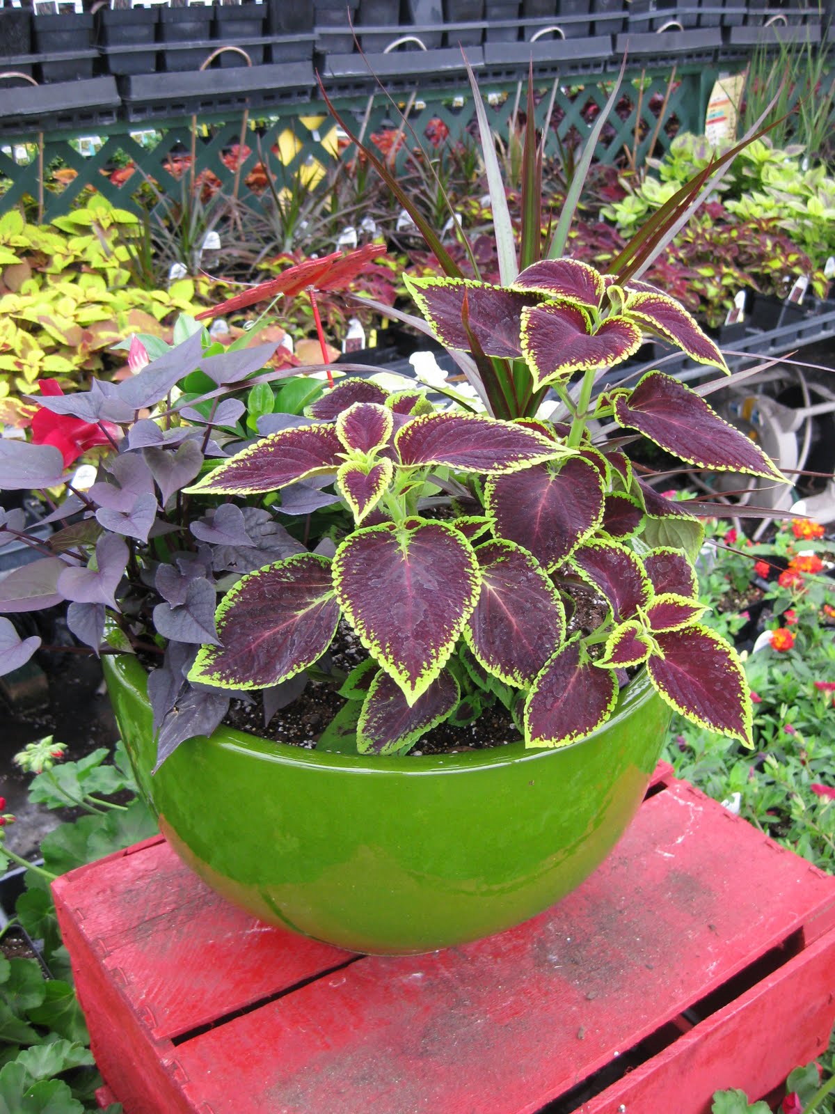 idea. See how the green margin on that coleus (Solenostemon) matches the container. Effective subtlety! It was nice for Marianne and I to get away for a road trip as we're still recovering from a mild case of "plant sale burnout."
