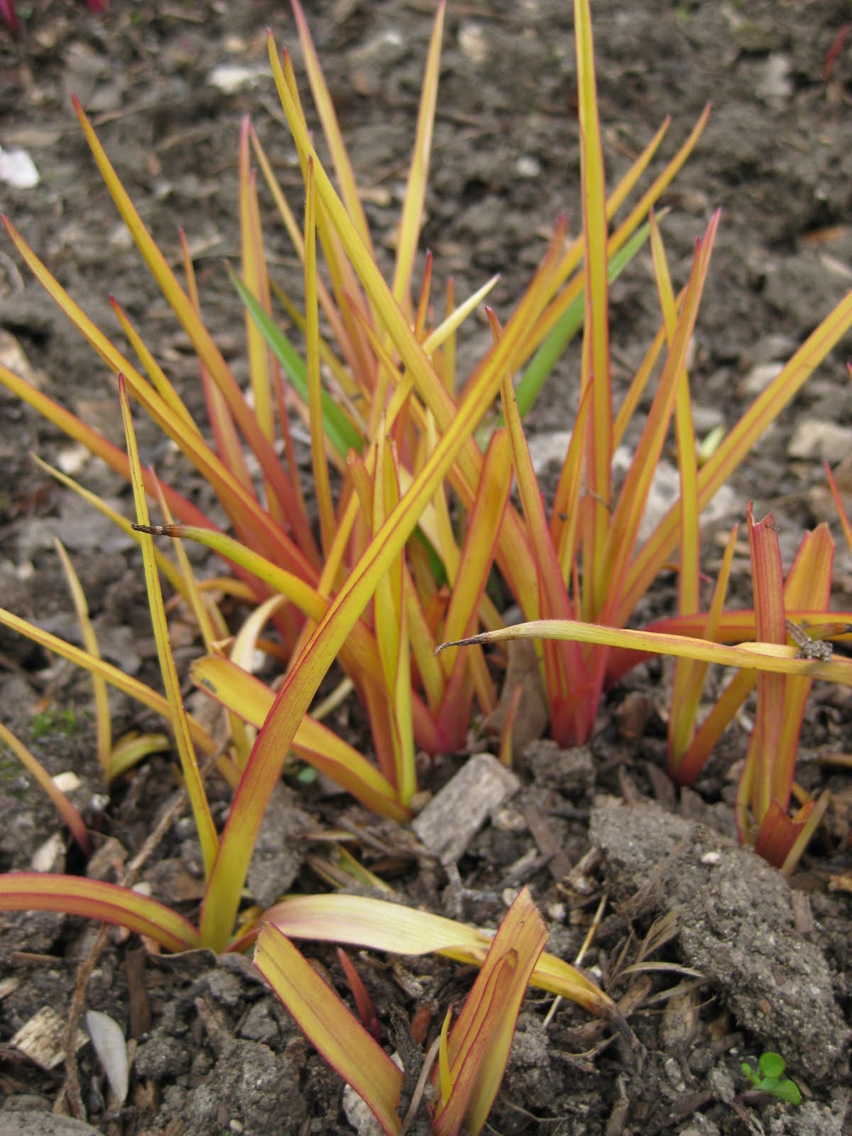 onday with some assistance. He spent most of the day, however, mowing out in the gardens. With about 6 acres of turf growing very quickly this time of year (I fertilized last week too...), Doc has always been on top of keeping it looking nice. To the left is the golden spiderwort (Tradescantia x andersoniana 'Sweet Kate') emerging with golden foliage with red highlights. These narrow leaves will be bright gold shortly (18" tall) and topped with blue flowers. This is one of the few spiderworts I like but be wary of its seedlings as most are just green. Be wary of all spiderworts as reseeders! Karen M. was in the Japanese garden cleaning up the pathways. We also saw Gary, Maury, Mary W. and Little Jerry popped in for