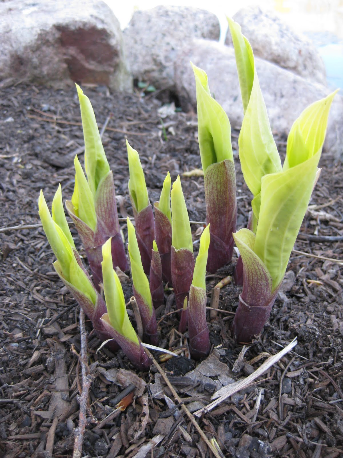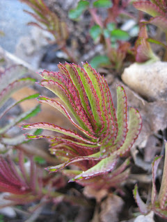 mation on our woody plant collection. I'm verifying all his data and making sure that Gary will have accurate information for the new labels. This afternoon, I sprayed another round (4 gallons) of herbicide in some of our weediest areas and in spots that would help streamline our mowing. While I'm not a huge fan of chemicals in general, I justify my use of herbicides as I target areas that would be near impossible to hand weed (patios, slopes, etc.). With very few exceptions, I do almost all the herbicide applications as I feel it is important to be consistent and if there are any "errors", I'm the one to blame! To the right are the emerging leaves of 'Designer Genes' hosta (Hosta) that will have reddish stems too. I like this hosta a lot and look forward to adding new varieties of hostas each year. To the left is