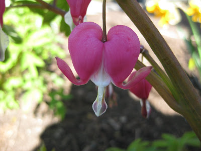 nt very well and Mark took footage in the wishing well garden (Children's garden), Japanese garden and gazebo garden. The interview and footage will air this Sunday morning (7:40 am?) and will encourage viewers to visit the gardens (perhaps for Mother's Day). This Friday is also National Public Garden Day (see http://www.rotarybotanicalgardens.org/ for information on this opportunity, including directions for printing out a free admission pass to RBG for that day) and we hope to see plenty of visitors enjoying the gardens. To the right is the vertical planter with the ornamental mustard (Brassica juncea 'Brazen Brass') starting to establish. Janice added some blue pansies (Viola) yesterday and this arrangement should be solid color in the next four weeks.Marv and Terry (aside from their container prep mentioned above) worked on another small retaining wall, rototilled, set-up obelisks and mowed. Big John did a nice job rototilling three of our huge annual beds and moved on to mowing and mulching. Larry also mowed and helped organize our plants out in the yard. He is also plugging thru his handyman tasks as well. Marianne tidied up here and there, did a nice job on her cutting display and spent most of the day cleaning up the rose garden for looming weddings this Friday evening and Saturday afternoon. Kay was in to weed and quickly joined Marianne in the rose garden. The ladies weeded the rose crescents but also pruned back all the dead stems on the roses (laborious!). We also saw Gary, Vern, Mary W., Shirley H., Maury, Bob T. and Dr. Gredler. Doc mowed but also took our big truck out for a new tire. Directly below is the exquisite bloom of the bleeding heart (Dicentra spectabilis). The bleeding hearts are just starting to bloom and should look nice for the weekend. What an interesting flower! Further below is a young leaf of the katsuratree (Cercidiphyllum japonicum) with some nice backlighting.