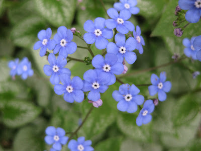 Above are the primary features of one of my top ten favorite perennials. This is the 'Jack Frost' false-forget-me-not (Brunnera macrophylla) and you can see the merit of its beautiful, silver-highlighted foliage and the nice (but all too ephemeral) spring bloom clusters (hence the "false forget-me-not" name). I don't grow weary of seeing or photographing this perennial and we have planted probably 30 or 40 of these around the gardens for primarily their silver contribution in part shade and their proven, extreme durability. I've featured 'King's Ransom' false-forget-me-not (Brunnera macrophylla) in previous blogs and while it has similar features to 'Jack Frost', it has yellow/chartreuse highlights, particularly in spring and more pronounced on younger leaf edges. Some plants look sickly with this color but I don't mind it at this point. The specimen of 'King's Ransom' below is one of many in our woodland walk garden. This variety also has the neat blue flowers.