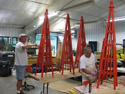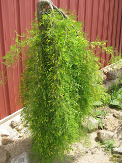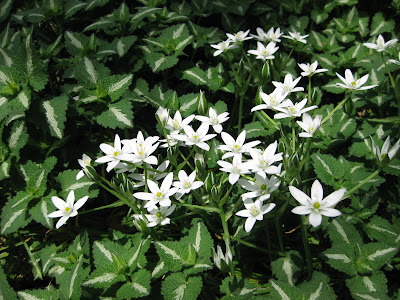 Marianne and Big John started the day by helping clean the Horticulture Center and Marianne went on to help prepare handouts, potted up the last of our summer bulbs, tidied up here and there, made copies and collected some label information from our new perennials that will be translated in to new labels soon. John and Pat hauled some items to storage and did a nice job putting the last coat of red on our freshly painted obelisks (see bottommost photo). Pat also prepared labels, cleaned up the carts and kept busy inside. John did get some weeding done too out in the daylily collection where quack grass is preparing for a repeat performance from previous years. Marv and Terry, after their plant run, did some shopping for fertilizer, shovels and fuel and returned to fill up our mobile raised beds with their custom potting mix and helped with odds and ends. To the right is the cutleaf weeping peashrub (Caragana arborescens 'Walkeri') at The Flower Factory just starting to bloom with yellow flowers. We have one in front of our visitor's center as well. I didn't take too many shots today so am borrowing some from yesterday! Below is a white starflower (Ipheion uniflorum 'White Star') blooming up thru the patterned foliage of a deadnettle (Lamium maculatum). Nice combo!