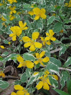 his variety at the gardens as well. To the above left is the variegated Japanese kerria (Kerria japonica 'Picta') in bloom. I've featured some kerrias recently and like this one for the extended foliage contribution. This variety is not as vigorous as any of the green leaf varieties but is still quite showy. To the right are some plug trays (400 plugs) that we received today from Skagit Gardens. They were packed nicely in these mesh sleaves. You can see hints of chartreuse from these small golden Irish mosses (Sagina subulata 'Aurea') that we'll hopefully plant in our fern & moss garden tomorrow. Although not true mosses, Irish mosses (particularly the gold) will be a nice contributor for color and texture in the open gaps of this space.