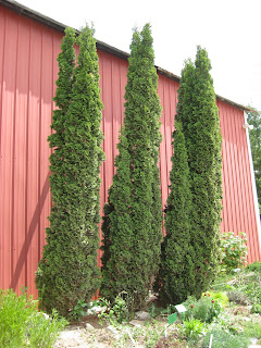 r will be more conducive for planting. Maury was in for a bit and Gary (see at bottom) came in to show Pat and John how to secure the new labels on their aluminum stakes. We also saw Bev D., Dr. Yahr, Bob T. and some others. The weather will be sour for the next day or two with some overnight lows in the upper 30 degrees F. UGH! That doesn't bode well for our tropicals but we have little recourse for protecting so many plants out in the yard. They will certainly be "hardened off" though. To the right are upright arborvitae (Thuja occidentalis 'DeGroot's Spire') at The Flower Factory that I remember being planted about 10 years ago at 3' in height. They are still quite narrow and are nice verticals along a tall wall that can use the visual anchoring and reference. We have some of t