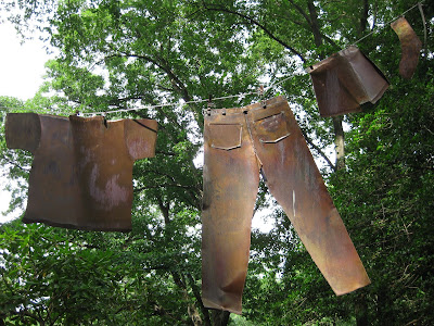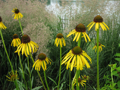 guidance" for these vines as they like to grab on to neighboring plants as well and grow laterally. To the right is another shot of the American elderberry (Sambucus canadensis) growing in clumps along our shoreline above the zig-zag bridge. The birds will appreciate the berries in the coming weeks and we almost always enjoy seeing wildlife in the gardens. Another purpose of RBG is as a wildlife refuge although we don't enjoy the increasingly damaging deer browsing and some of the activities of woodchucks, bunnies and voracious Japanese beetles. Regardless, we hope to see more pollinators soon (bees, butterflies, etc.) and recent wildlife sighting include a large, soft shell turtle laying eggs and a hyped up muskrat along our shoreline. Our minimal chemical use policy in the gardens is also related to our appreciation of wildlife and minimizing any negative impact to those populations. Directly below is a bloom close-up of a sulphur cosmos (Cosmos sulphureus 'Cosmic Orange') which has a profusion of vivid blooms throughout the summer (18" high). At the bottom is the silvery foliage of the 'Black Futsu' winter squash (Cucurbita moschata) that is part of Janice's 2011 squash display at the Horticulture Center. This rare variety (popular in Europe) is known for its heavy ribbing and dark color which ripens to an orange coloration. This squash supposedly tastes like hazelnuts. We'll see! Plenty of watering tomorrow and it will be a hot one!