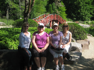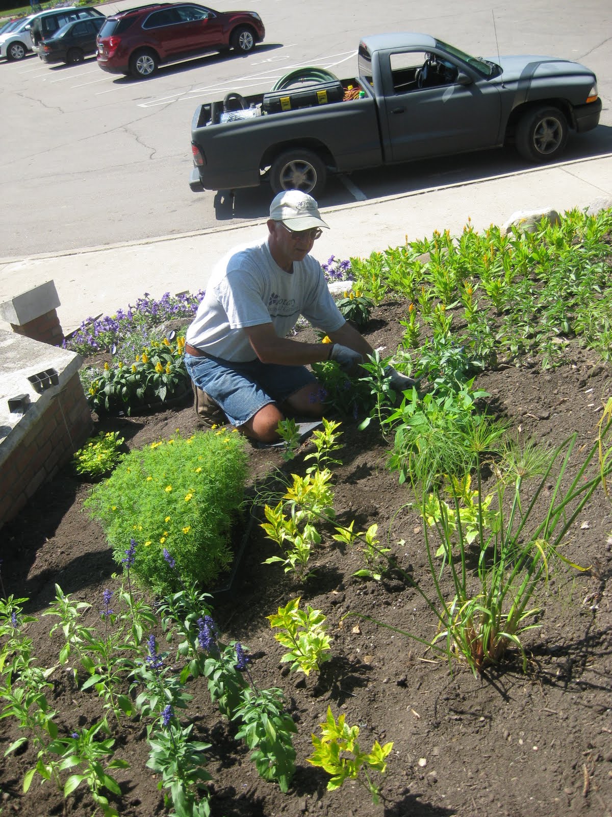 erica Selections (AAS) in 9 large beds near the visitors center. To the right is a neat, double snapdragon (Antirrhinum majus 'Madame Butterfly') that was an AAS winner back in 1970. We like to feature older varieties too and the azalea-like blooms on this multi-colored (not just red!) snapdragon are amazing. To the left is the start of the drumstick allium (Allium sphaerocephalon) which is a beautiful, violet-maroon "ovoid" of color hovering at about 30" in height. This fall-planted bulb, while a late bloomer, is also a rampant re-seeder so let the buyer/planter beware. To the right are the peak blooms of the often planted but "never to be ignored" smooth hydrangea (Hydrangea arborescens 'Annabelle'). This hydrangea is a workhorse and will bloom on new wood after being cut to the ground each winter at the gardens. Ample moisture is a must for nice blooms like this.We had a great turnout of volunteers today. The weather was in the mid 80 degrees F and while the morning was pleasant, the afternoon was quite muggy. I was able to lay out more plants this morning and our first shift of planters included Janet (new volunteer), Mary, Marilyn, Ernie, Karen, Shirley, Hal, Doris and Judy. Directly below, from left to right, are Mary, Janet and Ernie planting in the gazebo garden this morning. The gang did a nice job planting four areas and Judy actually planted for six hours straight (see Judy in the second picture down)! Our afternoon planters included Gena, Mary, Myrt and Nancy. The ladies planted two areas, watered and moved on to some crucial and well-timed weeding. Karen M. was in to prune and tidy in the Japanese garden and Jumbo Jim came in with four RECAPPERS to help in that same garden. Grumpies included Rollie and Bill S. spreading mulch, Dennis spreading path gravel and Bob C. and Ron B. replacing fine gravel on some of our paths near the Japanese garden (see the guys further below and to the right). Dick H. worked on various projects including getting the next batch of stakes prepared for Ariel (RBG intern) who did a nice job swapping out our new labels for the old today. Dave, Bob A. and Jim worked on repairing/building our plant sale tables which will go in to service in about 10 weeks. Dr. Gredler was in to mow and water and Bill O. came in to tidy up out in the gardens. We also saw Polly, Kelli, Mary Kay, Dr. Yahr, Elsa, Chuck, Ray, Maury, Geesje, Glenna and many, many others. It was one of the busier Thursdays that I can remember.
