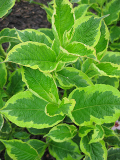 Penstemon 'Dark Towers') from the University of Nebraska. Topping out around 36", this perennial has the "double whammy" of great foliage (looks nice next to white and yellows) and light pink, trumpet shaped blooms in late spring/early summer (good for hummingbirds!). I like this variety a lot and for those that know 'Husker's Red' (similar), this one is undoubtably DARKER. To the right is the nice showy foliage of the variegated weigela (