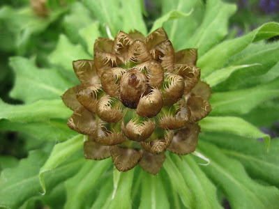 ason is a true travesty as all ninebarks should be left to show their natural form!With the rainy morning, I spent a couple hours catching up with all my invoices (3 weeks worth), desk work, phone calls, etc. I later went out to lay out plants for tomorrow's work day (8 am - 12 noon). I placed plenty of annuals along our entrance gardens slope that are ready for the attention of 25-35 volunteers (hopefully). See the bottom picture. Marv and Terry fueled up our vehicles, hauled plants for me (to the front slope), collected more debris, rototilled and tidied up in general. The guys also helped plant in the sunken and shade gardens respectively. Marianne also helped haul plants this morning, planted, tidied, did her cutting display and worked on the daylily collection labels. Janice also planted and spent time working with Ariel on putting out our new labels in both the fern & moss garden and the woodland walk garden. To the right is Janice's replanted vertical wall with herbs. Janice also prepared all our tools, etc. for tomorrow and is off on a well deserved vacation for the week. Jenny was in for a half day to complete her labeling, shifting and inventorying of the remainder of our plants out in the yard. While the image below looks like a spent bloom going to seed, it's actually the emerging flower cluster (will be yellow) for the Armenian basket flower (Centaurea macrocephala) which is in the same genus as bachelor's buttons. I'll take a picture of this perennial in bloom in a couple weeks and you'll be impressed. Further below is a bee working over the Jerusalem sage (Phlomis tuberosa 'Amazone') that has such nice tiered, violet blooms this time of year. This bee hardly noticed me and was quite intent on the flower.