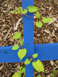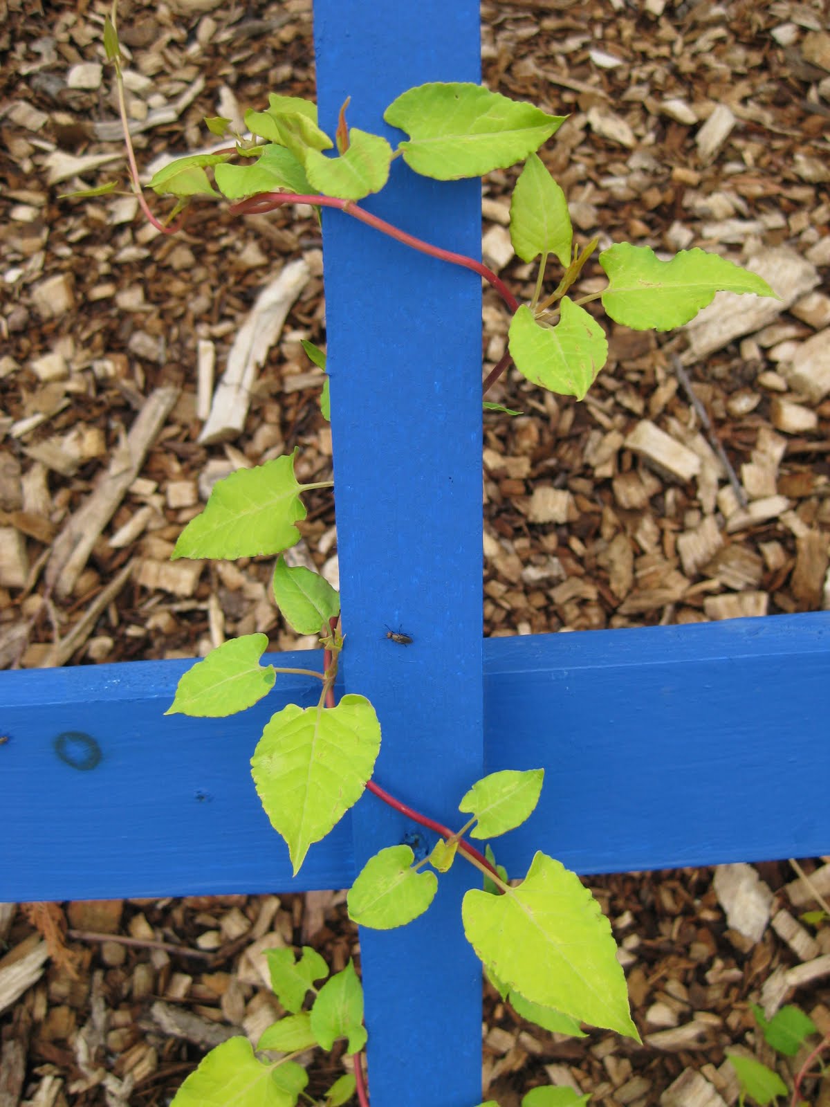 adn't grown too much and can be addressed early next week. We did tidy up all the wedding sites which was quite timely as a wedding showed up in the gazebo garden early this afternoon and we had heard nothing about it. Whereas we've traditionally hosted Saturday weddings in the past and will typically accomodate between 2 and 7 outdoor weddings during a Saturday, we're seeing more weddings on Friday and Sunday. It is challenging to keep the gardens tidied up for these events, particularly after a wind storm of the caliber that came thru our area on Wednesday evening this week. Today we also saw Kay D., Maggie, Chris, Elsa, Ellie and Maury was in to run some errands for us too. To the upper left is an interesting ornamental onion (Allium) aptly called 'Hair'. These (Allium 'Hair') are fall-planted and while not real showy from a distance, they are quite interesting close up and reach a height o 24"-30" or so. To the right is the start of our golden silver fleece vine (Fallopia aubertii 'Lemon Lace') starting to work up our blue pyramids in the entrance garden. The conversion from blue to yellow has begun! I hope for a strong turnout of volunteers tomorrow and decent weather. Next week will be crunch time for planting as I'm gone the following week (with Kelli) to the American Public Garden Association annual conference in Philadelphia. Directly below is Marv tidying up after some expert rototilling.