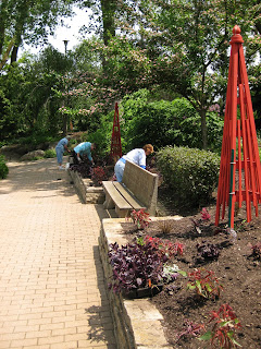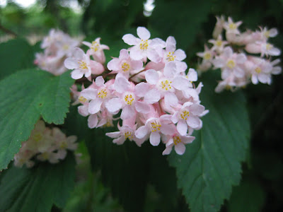 significant on the stream and waterfall. We hope to see this done yet this month as this garden will be featured as part of the Japanese-themed Dinner Dance at RBG on July 16th this year. The blooms directly above are the late spring, pink flower clusters on the Chinese neillia (Neillia sinensis) which is a durable shrub (rose family) in the 5' to 6' range. Our three specimens are in an area that receives no irrigation and they are doing well in average soil. To the right are Gena, Mary and a new volunteer (Myrt) planting dark-leaved basil in our maroon/red wall planting. To the left are the blooms of the red buckeye (Aesculus pavia) which are not only attractive to us but humminbirds as well. We have two small specimen