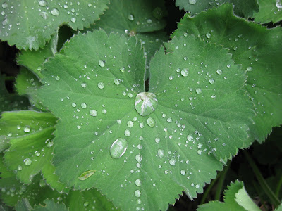 s in the gardens and everyone is asking for their identification. To the right are some containers that Janice and Marianne planted about three weeks ago. These contain a hodge podge of common herbs, peppers, tomatoes, etc. These will be channeled to the needy in the hopes that they'll not only get food from these but also get hooked on growing their own food, even in a container that size.Today was another crazy busy day with Grumpies, volunteers and garden tasks galore. John, Janice and Jenny all headed to the shoreline to finish the last of the planting that started on Tuesday. With the help of some Grumpies, it was completed quickly and Larry later watered it in well. I ran for a load of plants (180 flats or 8,000+ plants) early and it looks like we have another 3 or 4 total trips left next week to get the remainder of our items. Jenny spent most of the day organizing our plants in the yard and matching labels to the "priority plants" that will hopefully be planted this Saturday. Big John moved on to rototilling the thirteen beds in the arboretum which we'll hopefully plant this Saturday as well. He also weeded and watered. Larry, aside from copious amounts of watering, also repaired some irrigation. Janice helped coordinate some volunteers and did lots of weeding in the fern & moss garden which was in dire need of some attention. Directly below is one of our gigantic hosta varietes, 'Osprey' that is starting to engulf some of its neighbors. This specimen is 40" tall right now and almost 72" wide. Further below is the artistic dew drops on lady's mantle (Alchemilla mollis) that I never get tired of observing.
