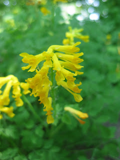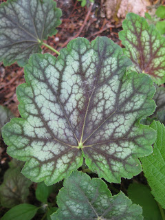 rite coral bell varieties. This is 'Dale's Strain' (Heuchera americana) that has such a nice, "stained glass" look on a green leaf. To the left are the pure white blooms of the wood cranesbill geranium (Geranium sylvaticum 'Alba') in the Scottish garden. To the right are the neat blooms of the yellow fumitory (Corydalis lutea) that reseeds (in a nice way) to fill in gaps in the shade a