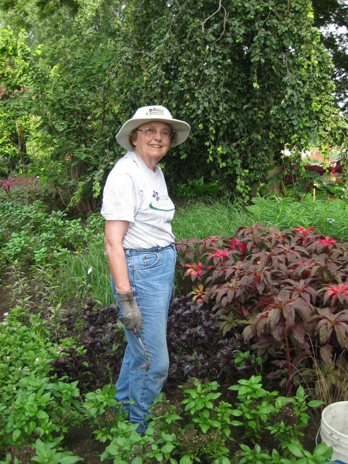 e (left to right) worked on constructing a bridge to get him back across. They can be seen trying to coax Jim across that chasm. Actually, the guys are building an all-access bridge across the spillway of the waterfall pool where the water enters the stream. The guys had to dig out some major rocks to widen what was formerly a narrow crossover point on a flat rock. This should look nicer and help accomodate accessibility in the Japanese garden. Gary and Dick K. worked on mulching the roses behind the pergola while Pat and Ron worked on additional mulching around the s