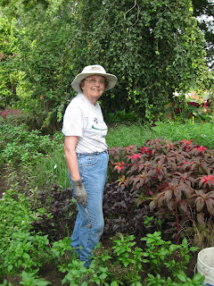 unken garden. Rollie was in to work on placing new memorial bricks and will continue this project tomorrow or later this week. He has been our "brick man" as long as I've been in the garden and it's nice he's finally placing them with the writing facing up this year. Dick H. worked on the dump truck (brakes?). Dick P. and Ron W. worked on some signage at the Parker Center and Dr. Gredler was in to mow. We also saw Dr. Yahr, Bill O., Kelli, Ray, Mike M., Darcie, Mark (new maintenance guy) and many others. To the above right is the 'White Dove' plantain lily (Hosta) in the woodland walk garden. To the left are the yellow culvert pipe planters with blue lyme grass (Elymus arenarius) in the terrace garden. To the right is Shirley working near the gazebo garden this morning. Wherever she goes with those weeding tools, weeds quiver with fear and hope to go unnoticed (small chance...).The ground staff did quite a bit of watering and weeding as it was too hot for any major projects. Marv and Terry set up plenty of pictures and tidied up some beds. Marianne hand watered and weeded in many locations and did another nice job with her cutting display. I've seen cutting display samples at other botanic gardens that help show the visitor where interesting plants are located out in the gardens (which is the same reason for ours). The Missouri Botanic Garden, Chicago Botanic Garden and Olbrich Botanical Gardens have cutting displays with either five or six samples. Ours has 12 samples and is refreshed three times each week by Marianne although Janice has done it is as well. This is an awesome feature to have at the gardens and I never have to worry much about it (aside from the occasional ID). Larry kept irrigation running, repaired irrigation heads and ran some errands. I caught up on various tasks and had two meetings. Chance of rain tonight which I hope hits us. Directly below is the 'Denver Daisy' (Rudbeckia hirta) black-eyed Susan in the North Point garden that was developed for the 150th Anniversary of Denver, CO (in 2008). I like this flower a lot and the blooms are 6-8" wide and very long-lasting. With our daylily (Hemerocallis) collection starting to peak out near the arboretum, I thought I'd share one of the many varieties that caught my eye this morning. At the very bottom is 'Tigereye Spider' which is just gorgeous. I'm glad Lisa has kept up with this collection and our new labels really make a splash.
