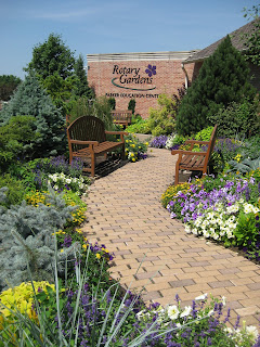 areas that are becoming dry. We've moved on to more critical hand watering in areas that don't get irrigated very easily and are trying to buy some time until we get a decent, soaking rain. The front entrance garden is looking great as seen in the two pictures above and the picture to the right. Marianne has done a nice job keeping everything looking nice and tidy. The blue/yellow theme has really hit stride and should be at peak over the next couple of weeks. To the left is the "original" summer poinsettia or fountain plant (Amaranthus tricolor 'Joseph's Coat') which is one of my favorites (edible too but tastes like spinach...). Unfortunately it doesn't look this good much past August but sure is an eyecatcher at 36" out in the gardens.