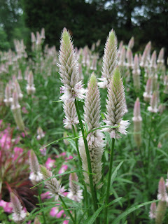 ause of accumulated debris (leaves, grass clipping, etc.) that affects water quality and the fountain. He found two plant signs that were tossed in there which is bothersome but not unusual. Karma will catch up... I had three meetings today although I spent some time scouting the gardens and pulling together plant groupings in our holding yard that will go to specific areas of need. We still have about 5,000 plants to install including perennials and some smaller woody specimens. To the above left are the picturesque blooms of the lemon bergamot (Monarda citriodora). The long-lasting flowers of this annual are edible and the leaves have various herbal uses. To the right are the pink, papery flower spires of the wheat celosia (Celosia spicata 'Flamingo Feather') which can be readily seen in the reception garden this year. This tall annual is great in a sunny border or either a fresh or dried arrangement. It does reseed a bit but it's not bothered me enough not to plant it evey year anyway. Further below is our copper cheese vat "planter" with a centerpiece of golden elephant ears (Colocasia esculenta 'Elena'), filler of Autumn fuchsia (Fuchsia hybrida 'Autumnale') with its golden foliage with copper/orange highlights and a trailer of golden creeping Jenny (Lysimachia nummularia 'Aurea'). This container is in part shade so we always go for bright color to illuminate this corner of the English cottage garden. The cheese vat was originally from Monroe, WI and donated by a former RBG volunteer coordinator; Vicki D. At the bottom is the continued clean foliage of 'Jack Frost' false forget-me-not (Brunnera macrophylla) in the woodland walk garden.