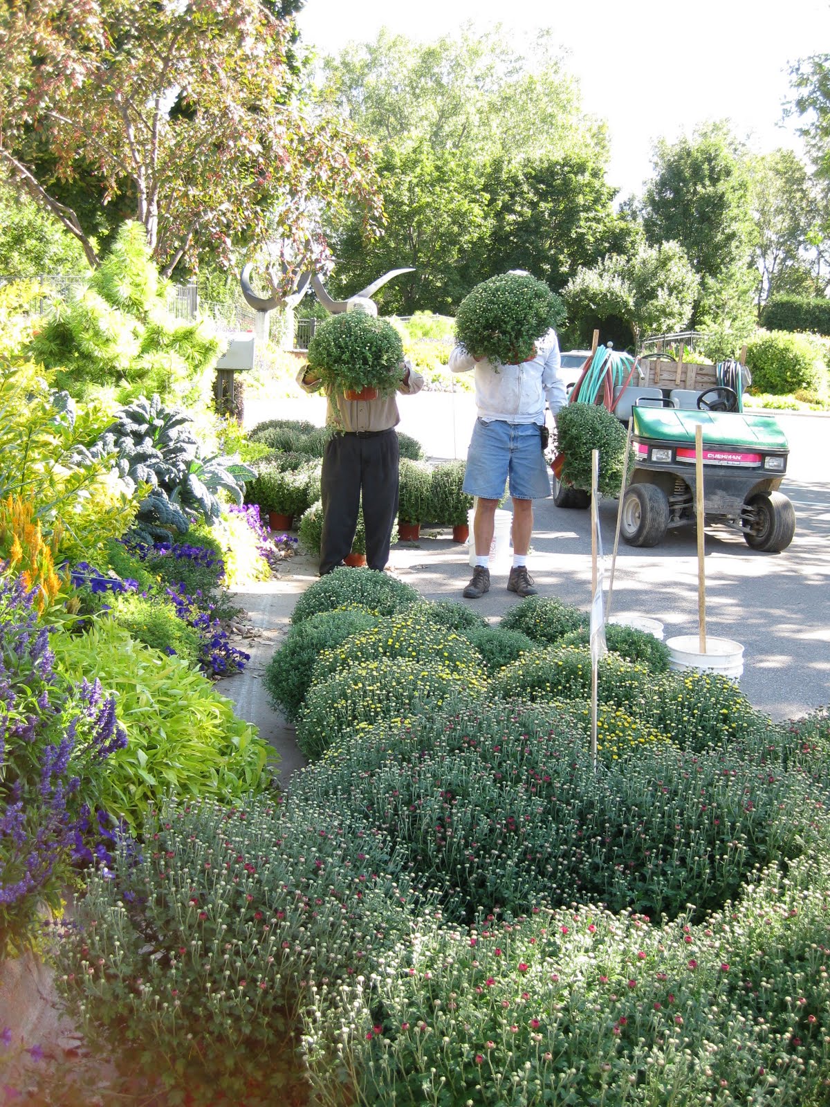 Colchicum autumnale) season. The 8,000 or so we planted over 8 years ago are just starting to bloom around the gardens... To the left are Bob A. and Jim (Dave was close by napping) working on repairing/stabilizing our back porch steps which have seen some wear and tear over the past 20 years. The guys did a nice job and continue to be a huge asset with their woodworking/carpentry skills. To the right is the sizeable batch of mums out front of the Parker Education Center that are being sold thru the gift shop. The gentlemen that hauled the mums to that location (seen to the right) are part of the witness protection program and had to screen their identity (with mums). We hope many of these mums will be sold tonight at the