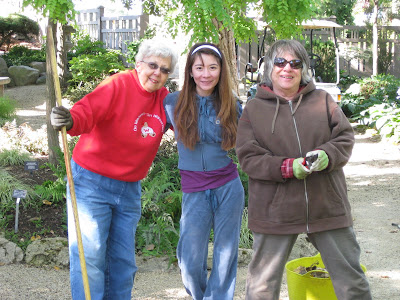 Cottage Garden Gallery (our gift shop) and all the artists and wares that are part of this newly organized shopping destination. The artists will be on hand, items will be for sale and there will also be a cash bar. Come check it out. Directly below, left to right, are Marilyn, Jenny and Karen (Grumpettes) that were working on fall clean-up down near the fern & moss garden. Peer further down in the blog to see them in action.