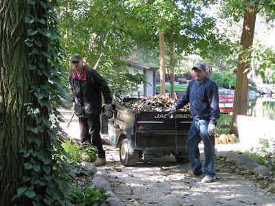 Ron W., Steve, Del and Dick H. started the morning by taking down two of our seven plant sale tents. These were our "non-essentials" as we'll have enough work getting the others down next Monday after the sale concludes at noon this Saturday (September 17th). The guys moved on to helping Dr. Yahr plant 15 large shrubs in the Japanese garden. Ron B. and Bob C. worked on raking leaves around the gardens and many of the other guys moved on to that work as well. As mentioned, the carpenters (Dave, Jim, Bob, sans Vern) worked on the back porch and have plenty of upcoming projects. Aside from the ladies above, Mary R. was also helping in that space and we also saw Glenna and Geesje this morning. In the afternoon, Mary, Gena and Myrt came in and did a nice purging of "yucky-looking" annuals in the North American garden. Many plants are limping along and I'd rather have a gap than a sickly looking plant. We are about a month out from planting our bulbs and will continue to extend the color as best we can. Chuck was also in to process our recycling. Dr. Gredler was here to mow and we also saw Kelli, Sally, Mary W., Pat, Vern (later) and many others. Janice had her Thursday volunteer crew in to rake leaves and they did a great job.