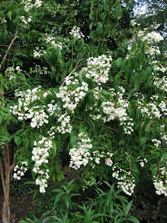 peppers as we toured that area. Needless to say, the peppers were hot and he was suffering greatly! To the left are the late season blooms of the seven-sons flower (