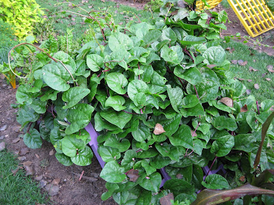 Basella rubra). This vigorous vine has nice deep green glossy leaves and reddish stems. The fruiting structures (berries?) are interesting too. When visiting my friend Ruth's garden recently we were nibbling it fresh and it wasn't bad considering I would sit at the table as a child for three hours looking at spinach gone cold, determined to win that battle of wills with my mother. I never won.