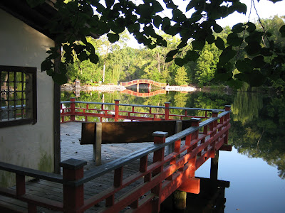 Rosa 'Radsunny') in the formal rose garden (note the artistic dew). This is a rose that just emerged as it is a deep yellow. Older rose blossoms of this variety age to a yellow-cream and the wide range of yellows on any given rose of this variety looks interesting because of the contrast. The bottom picture is from across the observation pier to the distant arched bridge..