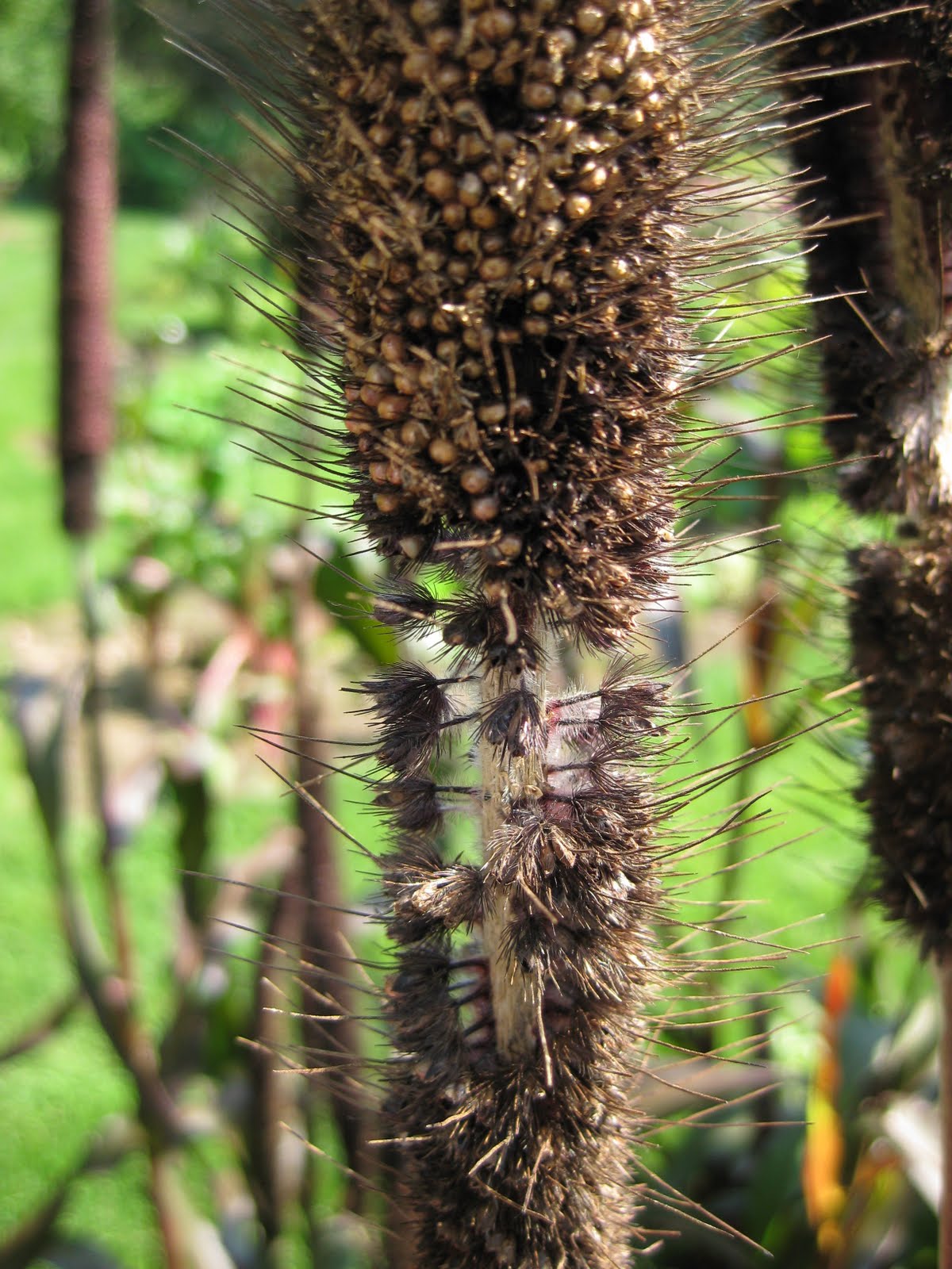 the weddings (one in the rose garden tonight), gravel work and loading up some plants for a delivery. These guys work together well and were Siamese twins in a former life I'm sure. Aside from mowing, Janice continued putting out our new labels, watered plant sale items and put up her mum signs. Marianne did her normal tidying out in the gardens and the cutting display. Later she helped water in the plant sale and is getting everything together for the "short week" of preparations next week before the sale starts on Friday, September 9th for RBG Friends Members only (9am-5 pm, 10% off). I worked on plant sale preparations as well. To the right is a seed head from the ornamental millet (Pennisetum glaucum 'Purple Majesty') in the Ornamental Edible and Compact Vegetable collection. Look closely and see what the finches are doing. They sure love the seed and we're seeing them increasingly target these seed heads as they ripen. Directly below is the always showy cardoon (Cynara cardunculus) in the same area as the millet mentioned above. Janice continues to cut back the lowest leaves on this artichoke (Cynara scolymus) relative as they flop. The bold texture of this silver plant is quite fetching even when we don't see the huge violet-blue flower clusters. At the bottom is another shot of the North Point garden which continues to be photogenic and will host another function tomorrow.