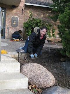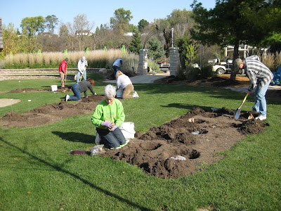 We had our seventh of seven work day today and had a great group of over 20 volunteers out in the gardens to help assist with bulb planting, fall clean-up and other duties. We planted over 2,000 tulips (Tulipa) in front of the Parker Education Center as well as 500 'Mt. Everest' ornamental onions (Allium). We have another 1,000 or so tulips to plant out front on Monday and still have other bulbs to install yet this month. After planting and tidying up out front, we shifted down to the Nancy Yahr Memorial Children's Garden and planted over 1,000 lily (Lilium) bulbs for early summer fragrance in the Smelly Garden next year. Our team worked well together. Special thanks to Big John and Janice who both facilitated the work day this morning and we had some help from Larry as well. Larry had some other duties and we also saw Dr. Gredler here mowing and Bill O. was around collecting garbage and debris from around the gardens. Our bulb planting (etc.) volunteers included Ron, Bev, Jody, Sue, Marti, Sue C., Dawn, Rita, Mike, Bill S., Bob C., Dave, Larry, Alfredo, Marissa, Zack and Gary. Thanks everyone and thanks to Nancy N. who worked the register for our compost sale. We also saw Elle, Polly, Amanda and Laura B. today. All these images were from this morning.