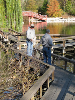 and Terry were in early followed by Janice and John. John was helping Mark S. with some work (as a volunteer) while Janice worked on some preparations for the upcoming symposium and made labels for our "soon-to-be-planted bulbs). Marianne finished testing/repairing our lights (YAY!) while Marv and Terry braved the cold and put up some lights out in the gardens (see to right). I worked on my presentation about Bulbs for next Wednesday, October 26th (6 pm - 8 pm) and worked on some other odds and ends. Kay was in to remove spent annuals in the reception garden and she came back with many loads. Dr. Gredler was in to mow and collect leaves and Del stopped by this morning to continue painting the plywood deer cutouts (white) for the Holiday Lights Show. Tomorrow is a work day and I hope we get at least 20 people in to plant our tulips, alliums and lilies! The bottom picture shows some happy gnomes at the home of our volunteers Ron & Bev (Happy 50th Anniversary!). Directly below are the late inflorescences (flower/seed heads) of the variegated maiden grass (Miscanthus sinensis 'Variegatus'). These heads don't emerge until October (as they do any many other varieties as well) but I like that pink tone. The volunteer appreciation dinner last night was a load of fun and attended by close to 110 people.