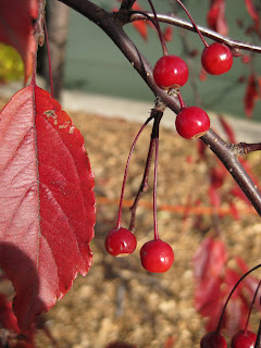 rmation. Many perennial grasses have decent fall color, including the Japanese silver grass (Miscanthus sinensis 'Blondo') seen directly above. From November thru March is a great time to evaluate the winter landscape and look for areas that could benefit from the impact and appeal of an ornamental grass(es) and colorful conifers for color and form. To the right are Marv (left) and Terry (right) preparing lights yesterday for some of their set-up tomorrow. That table has been used for Holiday Lights Show (HLS) related work since September although we do see light at the end of the proverbial tunnel with progress occuring daily. To the left are the fruits on the Royal Raindrops crabapple (Malus 'KFS-KW5') that also has maroon foliage in the summer that turns this bright red in fall.Big John, Larry and Janice started the day with indoor projects which included finishing decorating obelisks, repairing lights and bringing out some older wreaths and garlands with lights that needed to be replaced. Pat came in to help with this process and repaired lots of lights as well. Del was in briefly to work on his deer cutout project too. Larry helped organize the cluttered Horticulture center and hauled some of our "cluster" back o