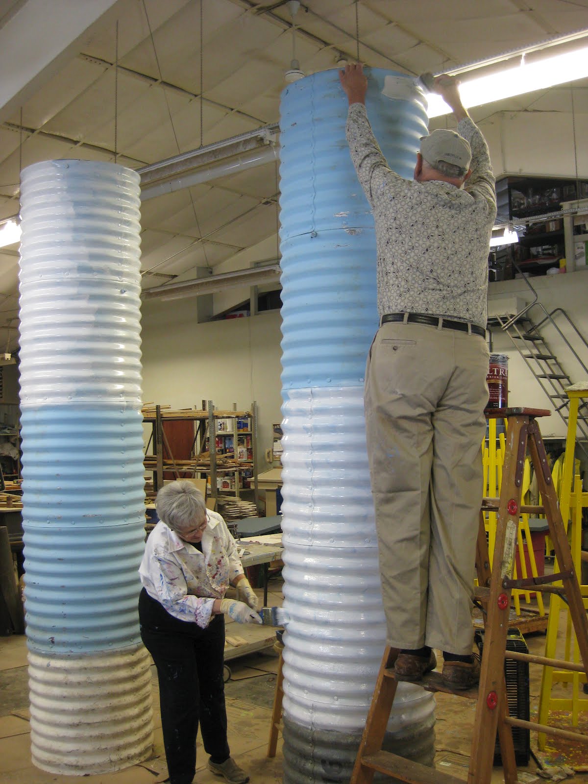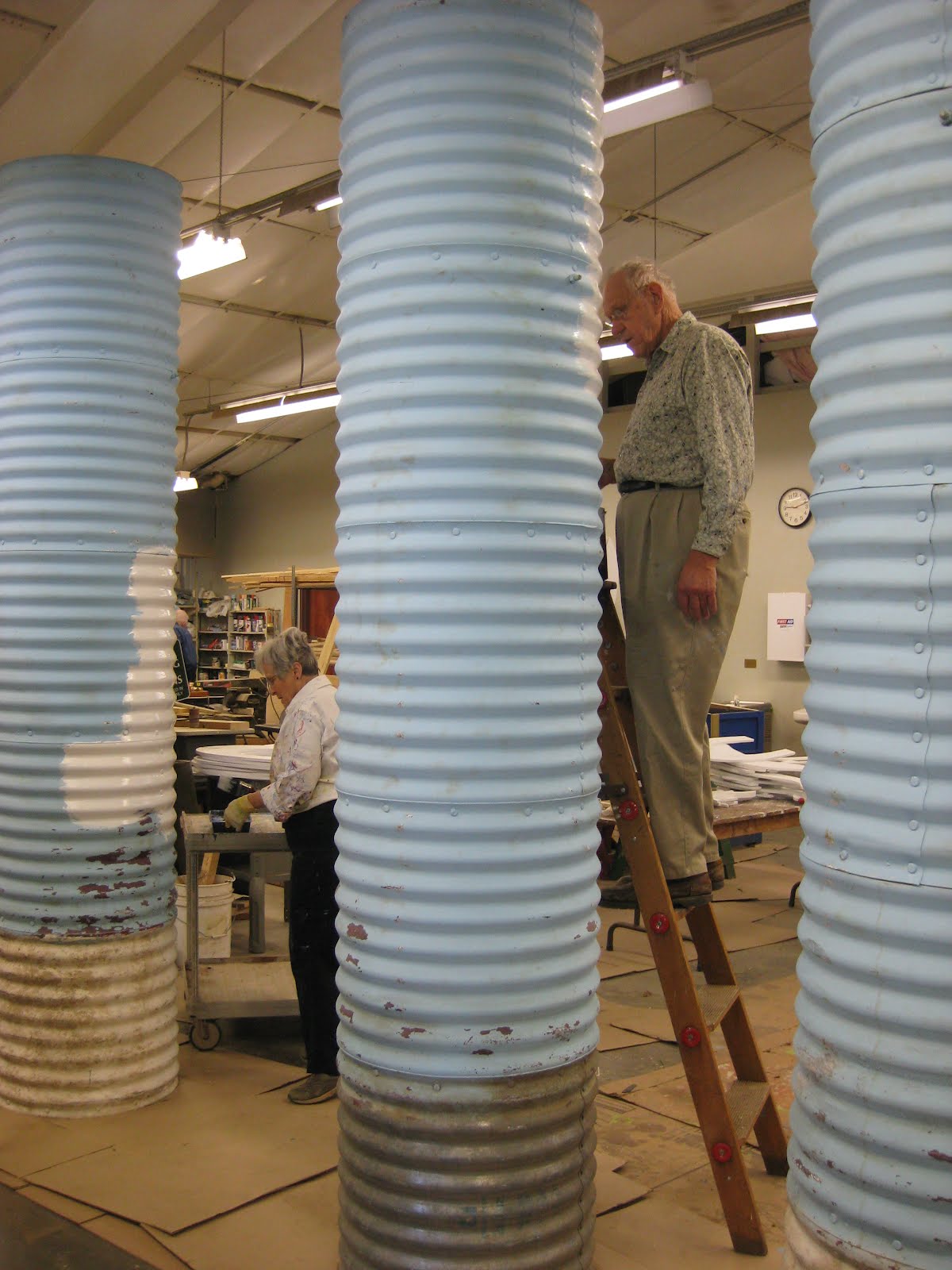 ollecting and hauling debris but we had four volunteers out there most of the morning doing just that. Aside from Pat above, who later moved on to pruning too, we had Dick W. cutting back grasses in the main parking lot and both Gena and Myrt came in and gave some attention to cutting back smaller grasses and doing "spring" clean-up around the east end of the gardens. To the left are Rose and Urban continuing to paint the next three culvert pipe planters. These planters have rebar cross supports that will help contain a literal trash can insert that holds the soil in the top 30" of the pipe. I have a neat idea for what to put up in these