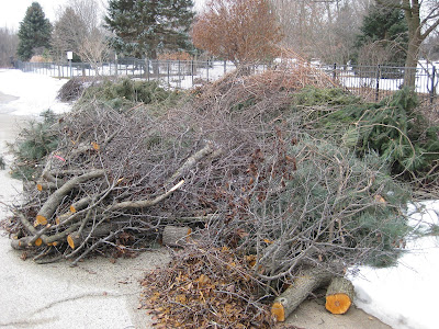 arieties that we're trialing and will also receive vegetative cuttings for some other varieties as well. Most of our trial varieties aren't commercially available yet. It is always fun to try new plants out in the gardens and share them (visually!) with our visitors. Marianne is also helping prepare handouts for the looming WPT Garden Expo (www.wigardenexpo.com/) that is coming up on February 10th, 11th and 12th. Big John and I will haul up all our stuff and set-up the RBG booth on that Friday morning. Gary was over to clean up the laser engraver which should improve the quality of the labels being produced. We'll see Luis tomorrow and he'll keep up with our labeling momentum. We also saw Janice, Big John, Dick H., Glenn E., Kris K. and others today. At the bottom is our pile of clippings, trimmings and brush from all the recent pruning and removals. Much of our larger debris is chipped up for use as mulch out in the gardens. This pile will only be getting bigger as we continue pruning efforts out in the gardens. The progress has been quite amazing. By the end of this week, I will have posted my 1000th RBG Hort Blog and am on the start of my fourth year doing it. I hope readers, who find it of value, will spread the word and help promote RBG.