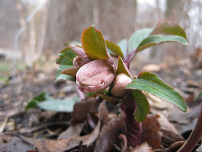 ng or preparing to bloom. I had only made it to the woodland walk garden when I saw snowdrops (Galanthus nivalis) in bloom (top picture). This was one of the few clumps actually blooming yet but most snowdrops seem to be poised. Normally I would show a picture like this in mid to late March. My first blog posting of snowdrops last year was March 8th. The picture directly above shows the blooms of a 'Cinnamon Snow' hellebore (Helleborus) getting ready to open. Hellebores bud like this for a long time before they open early for a couple weeks. Again, I normally wouldn't see this for at least five more weeks. To the right is another hellebore (Helleborus niger) budding out in the color rooms garden. Also called the Christmas rose, this specific s