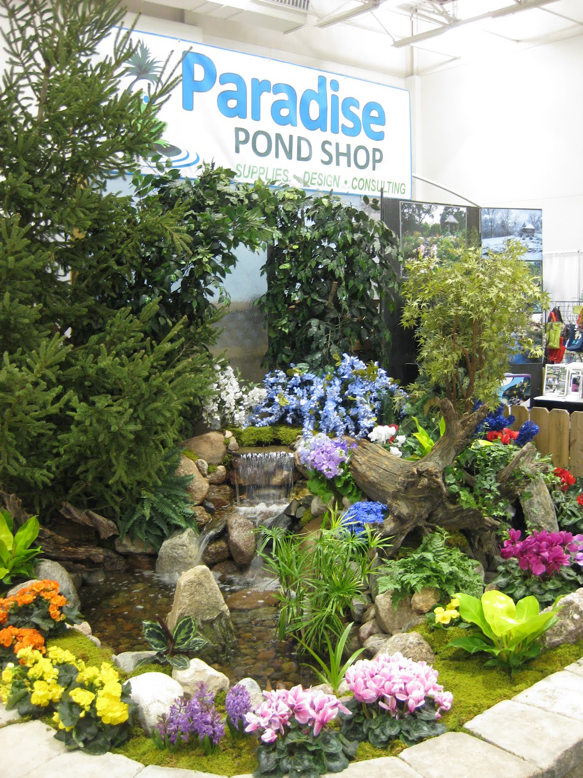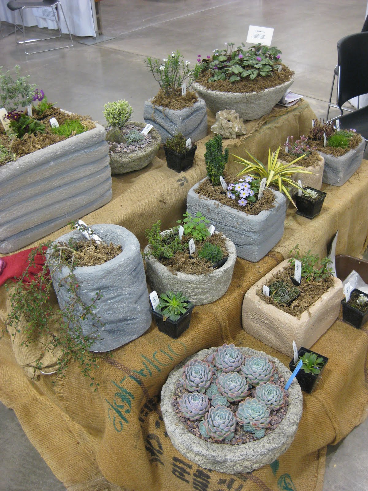 To the right (both pictures) is the display of alpines that the WI/IL Chapter of the North American Rock Garden Society set up at their booth. I love this type of gardening and I think this grou