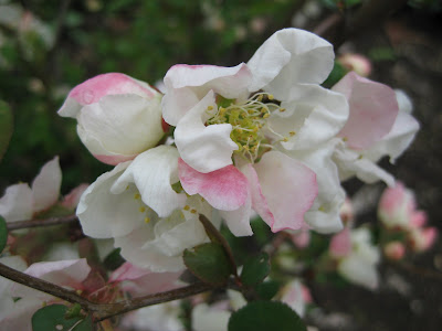 ooming, Terry will shear it back in to a perfect, 8' x8' "meatball" which keeps it contained and offers a rounded form. Though only a "one season" plant for interest, it sure steals the show. To the lower right is the 'Mt. Hood' grape hyacinth (Muscari aucheri) that I always enjoy for that little "snow-capped" white portion at the top of the flower. Our grape hyacinths (Muscari sp.) have all been five weeks early as well. Directly below are the pastel blooms of the contorted quince (Chaenomeles speciosa 'Contorta') which also has an interesting branching pattern. We have some other quince varieties and you'll know quince around your neighborhoods if you see a good-sized, oblong shrub with brilliant orange or pink blossoms as the forsythias fade. Further below is the brilliant red foliage of the 'Cherry Cola' coral bells (Heuchera) that holds that reddish tint quite nicely and I think is quite aptly named. At the bottom is one of my favorite leaf patterns and one I can't stop photographing. This is a young leaf of the 'Jack Frost' false forget-me-not (Brunnera macrophylla) but it carries this silvering throughout the year and we're just starting to see the start of the sky blue, "forget-me-not-like" blooms of this variety and many others.