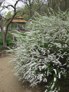 mage out in the gardens today but am really worried for commercial apple growers if we get a hard frost in the coming weeks. I'm glad I dressed in layers today and while my walk thru the gardens this morning was chilly, there was no shortage of plants in bloom. The top photo shows a view of the obervation pier, arched bridge, etc. thru a weeping cherry (Prunus sp.) and note the redbud (Cercis canadensis) to the right. Further above are the soothing blooms of the Virginia bluebell (Mertensia virginica) and directly above is one of my favorite perennials. I love the look of this golden bleeding heart (Dicentra spectab